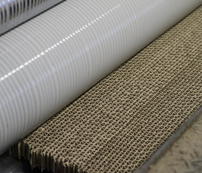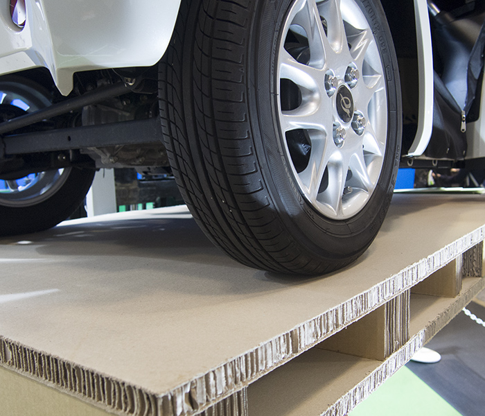 エコボードの中でも最もこだわった部分であり、1番歳月をかけて研究したのがエコボードの内側のコア部分とその外側に貼り付けるライナー部分の接着面です。もともとエコボードはハニカムボードにヒントを得て作られました。しかし、ハニカムボードはコアとライナーの接着力が弱く、曲げた時の耐久性に問題がありました。それを解決するために、エコボードでは、コアの部分を切断する際、独自の切断技術で切断面を大きくし、糊がつく面積を拡張。この切断面を実現するために、エコボード専用に作られたカッターを使用しています。その結果、エコボードは強力な接着強度を手にいれ、ねじれや曲げがかかったとしても、コアの部分とライナー部分が剥がれることなく木材のような曲げ強度を発揮。紙製のパレットの中でも1番の曲げ強度を誇っており、フォークリフトで持ち上げても、パレットがたわんで荷崩れを起こしてしまう心配もないので、物流の現場でも安心してご利用いただけます。エコボードは接着強度に力を入れて開発したからこそ、安心して利用ができるほどの曲げ強度を実現しているのです。
